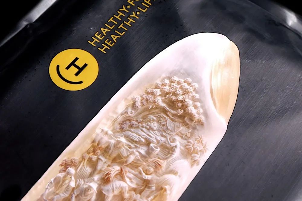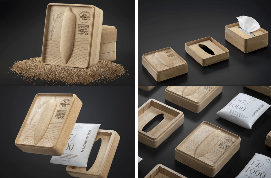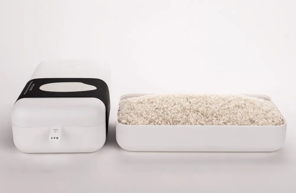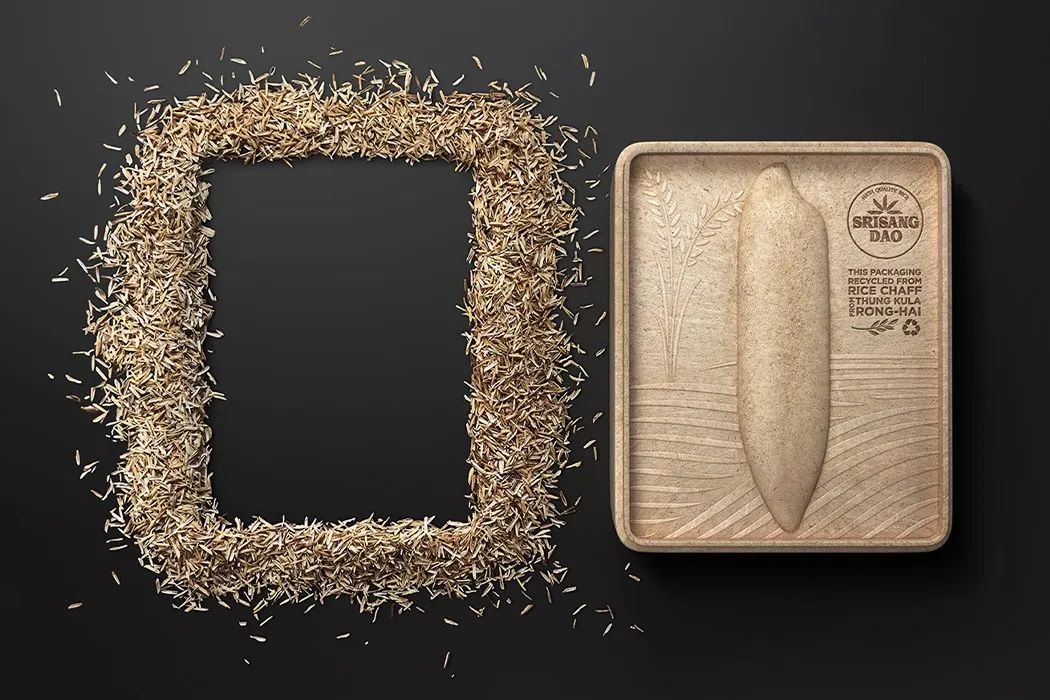 商家将谷物脱壳后的废料压制成硬度、致密度高的结构用作包装材料,通过将天然废料再生设计,让其重新应用于商品的生产、消费中,最大程度地发挥每一颗水稻的功能。