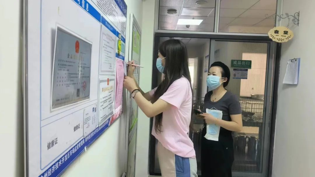在杨园长的陪同下,卫生部检查人员进入食堂实地查看食堂从业人员员健康证、食品经营许可证与食品经营范围。
