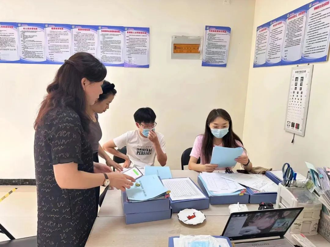 金山桥社区儿保科王大夫对新生入园体检单进行检查,有无特殊体质幼儿、疑似传染病幼儿进行指导。