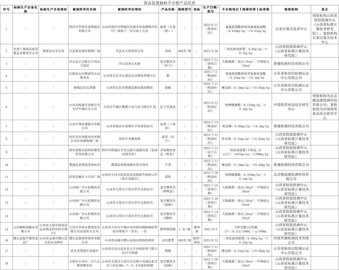 1、朔州市美特好连锁超市有限公司销售的生姜(袋),其中氯氟氰菊酯和高效氯氟氰菊酯不符合食品安全国家标准规定。检验机构为山西省检验检测中心(山西省标准计量技术研究院)。朔州市美特好连锁超市有限公司对检验结果提出异议,并申请复检;经石家庄海关技术中心复检后,维持初检结论。2、代县新家福乐购物广场销售的、标称甘肃·镇原县新星果品有限责任公司生产的杏肉,其中二氧化硫残留量不符合食品安全国家标准规定。检验机构为山西省检验检测中心(山西省标准计量技术研究院)。3、浮山县正宗陕记牛肉丸子面馆使用的复用餐饮具(杯子),其中大肠菌群不符合食品安全国家标准规定。检验机构为鲁健检测科技有限公司。4、沁源县沁河镇诚信志远果业店销售的梨,其中氯氟氰菊酯和高效氯氟氰菊酯不符合食品安全国家标准规定。检验机构为山东省新世纪检测认证中心有限公司。5、黎城县宏达菜铺销售甜椒,其中噻虫胺不符合食品安全国家标准规定。检验机构为山东省新世纪检测认证中心有限公司。6、山西永辉超市有限公司大同平城区分公司销售的妃子笑荔枝,其中吡唑醚菌酯不符合食品安全国家标准规定。检验机构为北京精益捷检测科技有限公司。山西永辉超市有限公司大同平城区分公司对检验结果提出异议,并申请复检;经中国肉类食品综合研究中心复检后,维持初检结论。7、山西中翔仓储超市有限公司销售的油菜(上海青),其中吡虫啉不符合食品安全国家标准规定。检验机构为鲁健检测科技有限公司。8、汾阳市恒利源实业有限公司恒利源购物广场销售西芹,其中氧乐果不符合食品安全国家标准规定。检验机构为山西省检验检测中心(山西省标准计量技术研究院)。9、朔州老雁北妈妈味餐饮管理有限公司加工自制的其他餐饮食品(粉条),其中铝的残留量(干样品,以Al计)不符合食品安全国家标准规定。检验机构为山西省检验检测中心(山西省标准计量技术研究院)。10、翼城县老黄蔬菜海味店销售的芹菜,其中噻虫胺不符合食品安全国家标准规定。检验机构为鲁健检测科技有限公司。11、阳高县鑫东方生活广场销售的荔枝,其中吡唑醚菌酯不符合食品安全国家标准规定。检验机构为北京精益捷检测科技有限公司。12、山西海广中心街餐饮有限公司使用的复用餐饮具(烤鸭盘),其中大肠菌群不符合食品安全国家标准规定。检验机构为山西省检验检测中心(山西省标准计量技术研究院)。13、山西海广中心街餐饮有限公司使用的复用餐饮具(面碗),其中大肠菌群不符合食品安全国家标准规定。检验机构为山西省检验检测中心(山西省标准计量技术研究院)。14、山西海广中心街餐饮有限公司使用的复用餐饮具(翅碗),其中大肠菌群不符合食品安全国家标准规定。检验机构为山西省检验检测中心(山西省标准计量技术研究院)。15、大同市华林永泰商贸有限公司前进街分公司销售的、标称山西梗峪泉醋业有限公司生产的静坤源陈醋,其中不挥发酸(以乳酸计)不符合食品安全国家标准规定。检验机构为山西省检验检测中心(山西省标准计量技术研究院)。16、稷山县惠特鲜商贸有限公司销售的、标称稷山县振华蜜饯食品厂生产的金丝蜜枣,其中二氧化硫残留量不符合食品安全国家标准规定。检验机构为河南华测检测技术有限公司。17、武乡县国斌生活超市销售的辣椒,其中噻虫胺不符合食品安全国家标准规定。检验机构为山东省新世纪检测认证中心有限公司。18、太原市小店区二分八云雁阁餐饮店使用的复用餐饮具(面碗),其中大肠菌群不符合食品安全国家标准规定。检验机构为山西省检验检测中心(山西省标准计量技术研究院)。