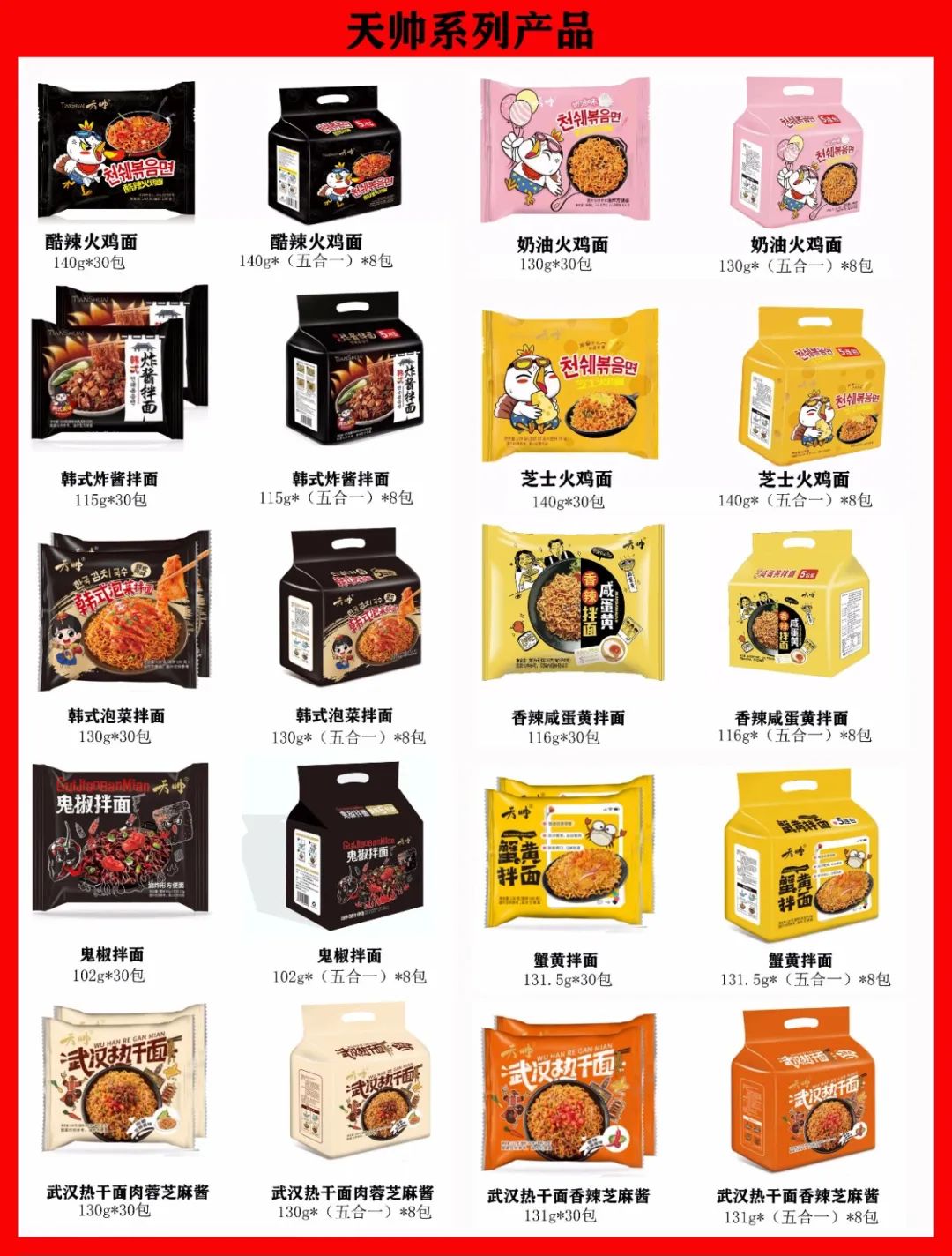 天帅食品,始于1992年,主营火鸡面、炸酱面、拌面、热干面等各种网红食品,量大美味,方便携带,品质保证,售价在同品类通用价格带,一区一户,无线上影响,可操作空间大,保证经销商利润!!