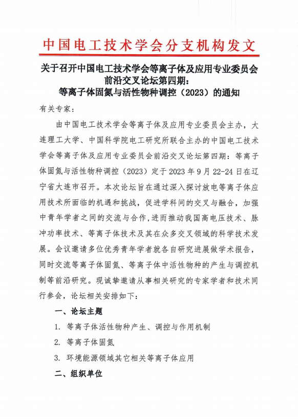 关于召开中国电工技术学会等离子体及应用专业委员会前沿交叉论坛第四期:等离子体固氮与活性物种调控(2023)的通知
