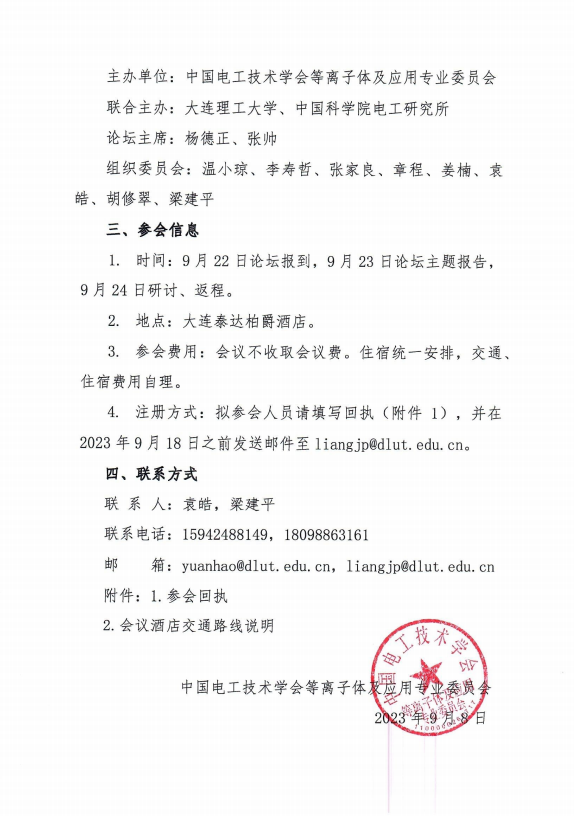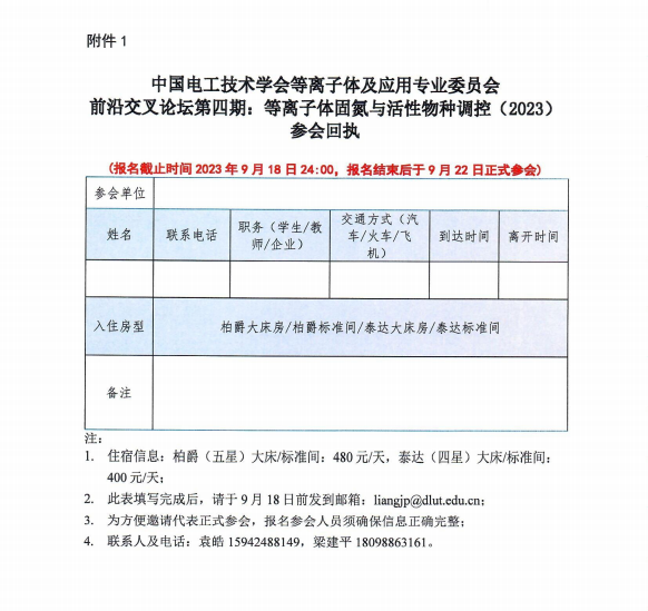 拟参会人员请填写回执(附件1,后附下载链接),并在2023年9月18日之前发送邮件至liangjp@dlut.edu.cn。
