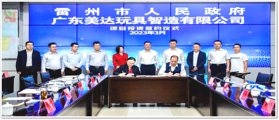 7月16日,雷州市产业聚集片区基础配套设施建设项目(一期)暨美达塑胶电子玩具生产基地项目奠基仪式隆重举行。该项目总投资6.5亿元,达产后可带动5000人就业,这标志着雷州市招商引资工作再添硕果,见证引领雷州轻工业迈进新领域。▲2023年3月雷州市与广东美达玩具智造有限公司正式举行项目签约计划投资新增注塑机80-100台,喷油位200余个,移印机150余台,装配/包装流水线25条,车衣部,预设衣车350台车,电子部,预设5条生产线,搪胶部,预设搪胶炉20个。工厂建筑面积18500㎡,其中生产车间面积9000㎡,宿舍5000㎡,写字楼1200㎡。布局合理规范,设施完善,设备齐全,生产、生活、工作环境优良。东莞美达塑胶制品有限公司