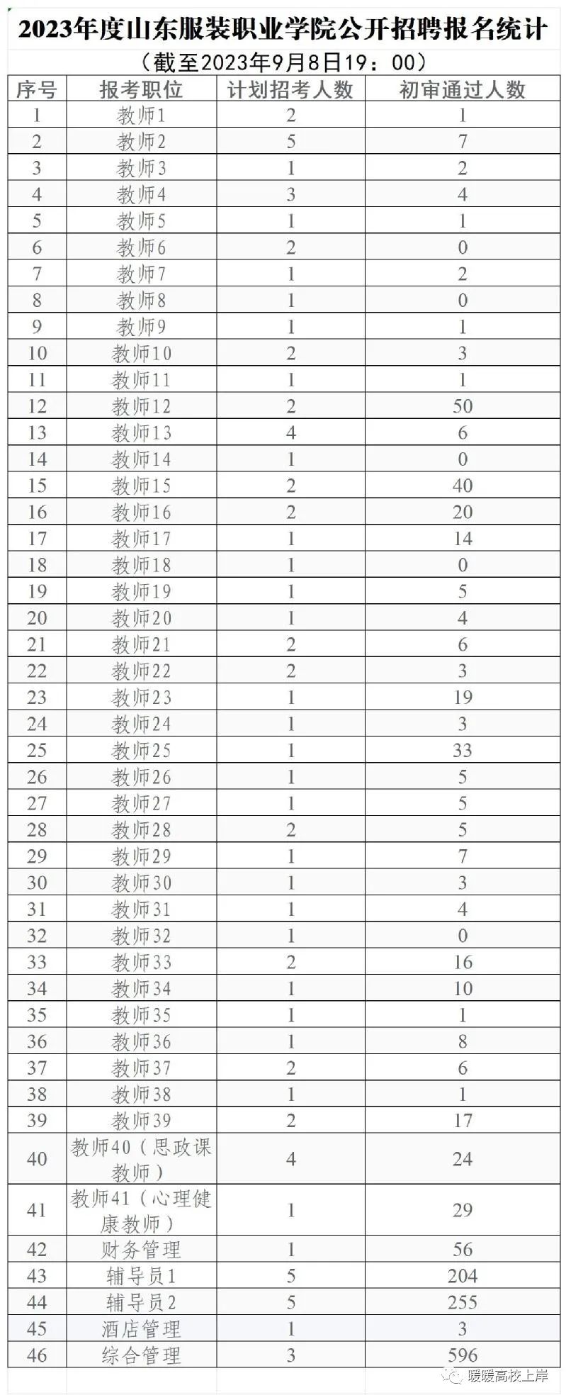 【报名统计】2023年度山东服装职业学院公开招聘报名统计(截至2023年9月8日19:00)