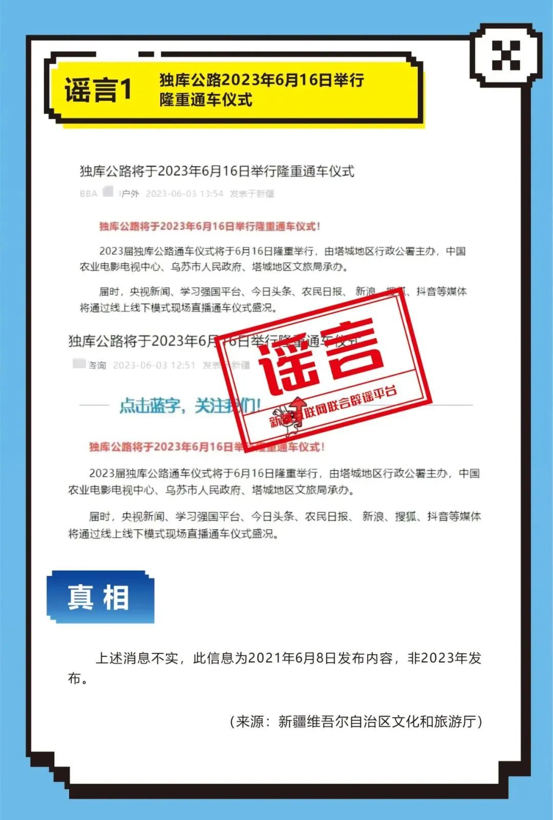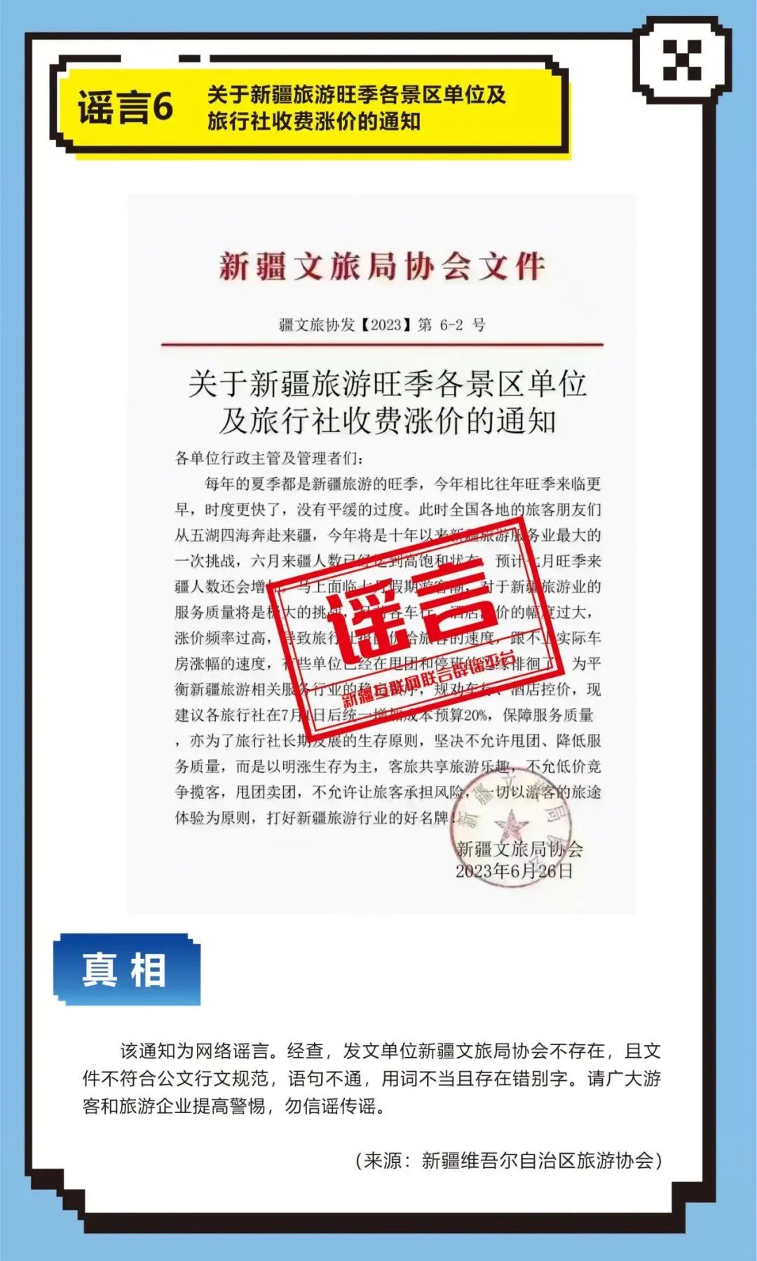 2023年6月26日,网民李某为招揽游客、增加网络账号粉丝关注量,在网络平台发布题为“新疆旅游旺季各景区单位及旅行社收费涨价”谣言图片,引发网民传播扩散和媒体关注,造成不良社会影响。公安机关依法对李某予以行政处罚。2、昌吉公安机关依法查处赵某编造“新疆大巴扎暂停营业”网络谣言案。