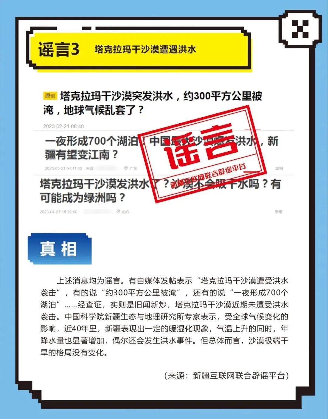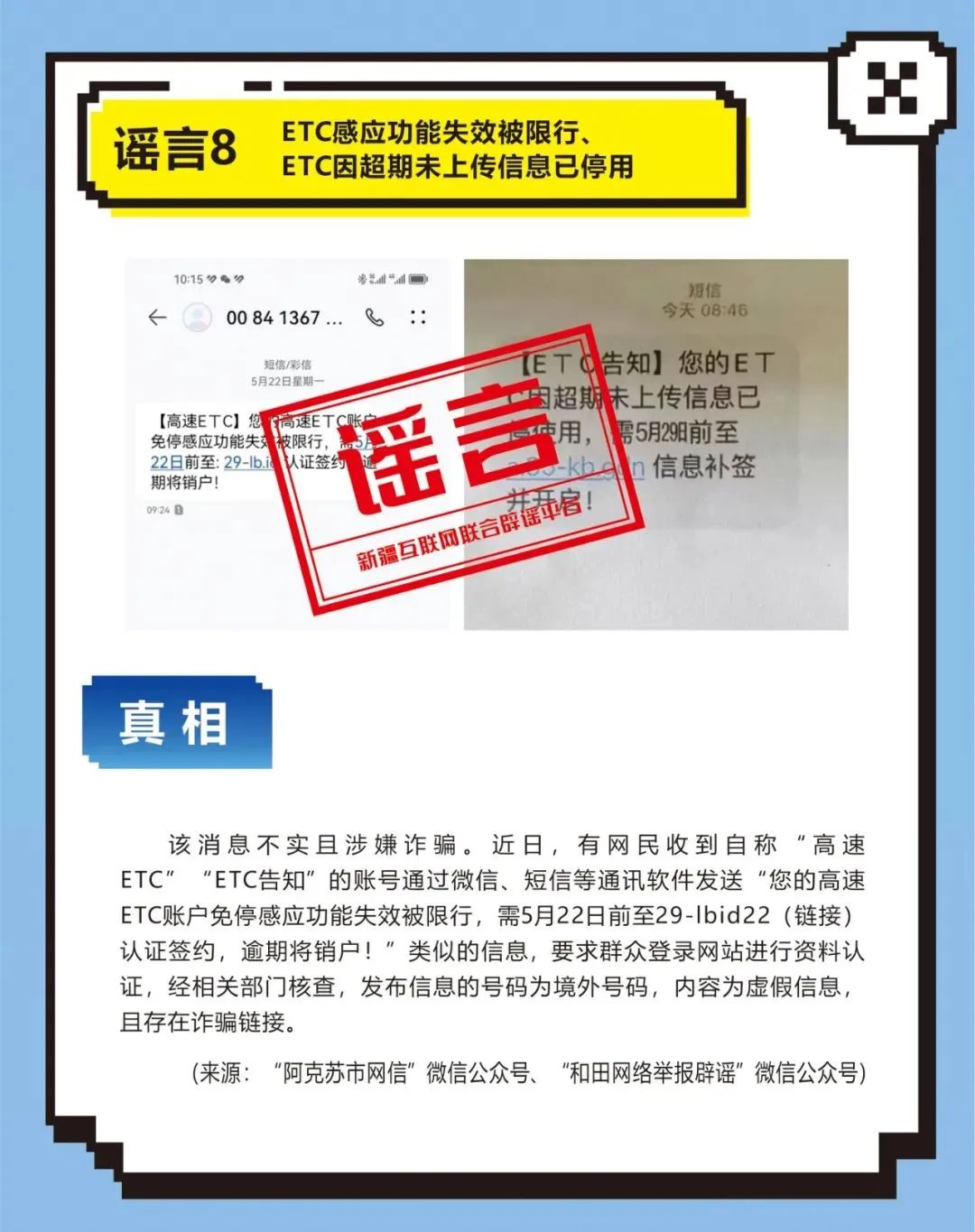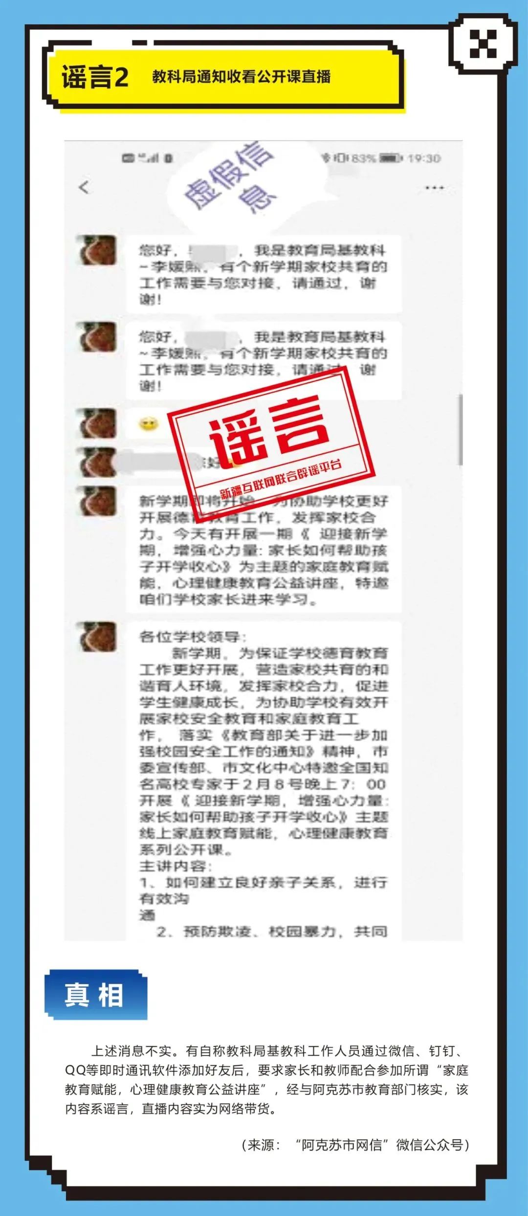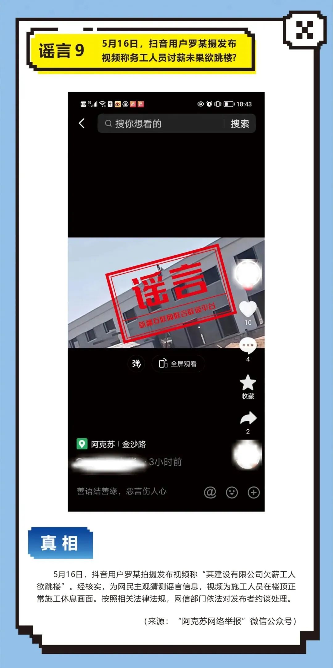 2023年6月11日,哈密网民李某为引起网民关注,在网络平台发送谣言信息“小区一位抑郁症患者因孩子成绩不理想跳楼自杀,我们小区已经有3位抑郁症患者跳楼自杀了”,引发网民关注讨论。其认识到谣言的社会危害性,主动删帖辟谣。公安机关综合调查后对其予以批评教育处理。8、塔城公安机关依法查处赵某编造“香蕉NG病毒亡人”网络谣言案。2023年5月8日,塔城网民赵某在网络平台发布“某地医院有人因吃了被NG病毒感染的香蕉死亡,救治医生全部被隔离”的谣言信息,扰乱社会公共秩序。经塔城公安机关调查,赵某对编造网络谣言的违法行为供认不讳。鉴于其认识到违法行为危害且积极配合辟谣,依法对赵某予以批评教育处理。