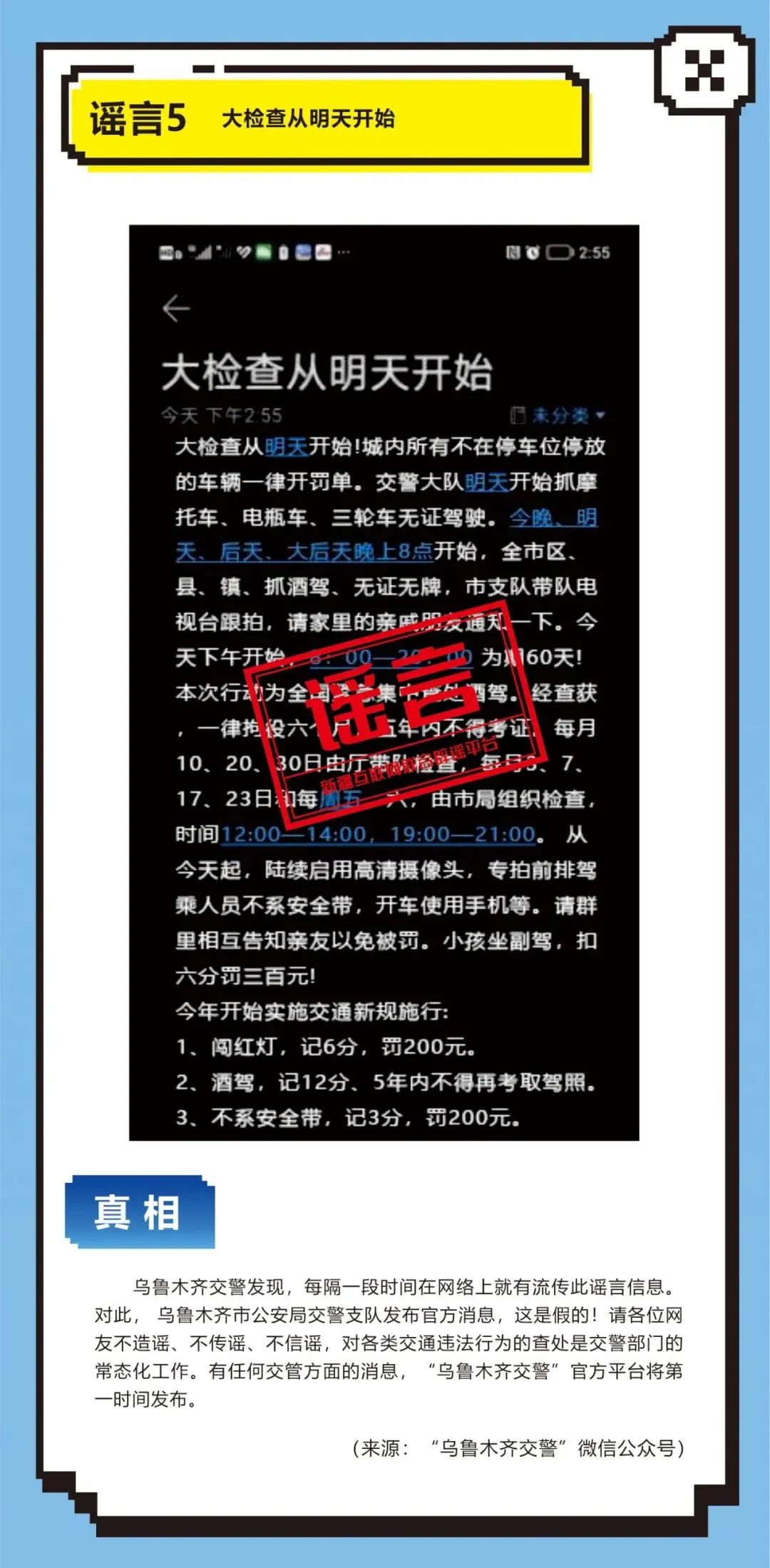 2023年5月5日,博州网民周某因超速行驶被交警依法拦停检查,期间周某阻碍执法,并为宣泄不满,拍摄视频在网络平台造谣称“新疆交警无证查车”,引发网民关注讨论,扰乱社会公共秩序。经博州公安机关调查,依法对周某予以行政处罚。6、吐鲁番公安机关依法查处马某编造“游客在吐鲁番沙疗死亡”网络谣言案。