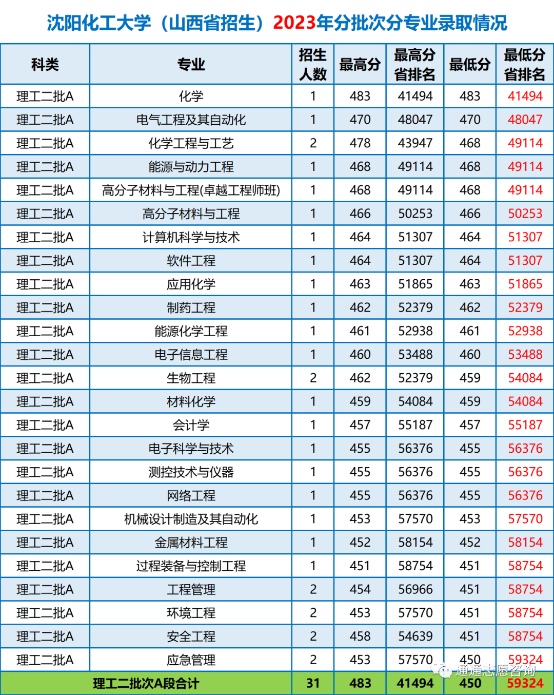 2023年在山西省累计计划招生31人,在二批次A段招生,仅有理工类专业,其中排名靠前的专业有化学、电气工程及其自动化、化学工程与工艺,录取最低分省排名在59324名,比去年上升了4000多名。