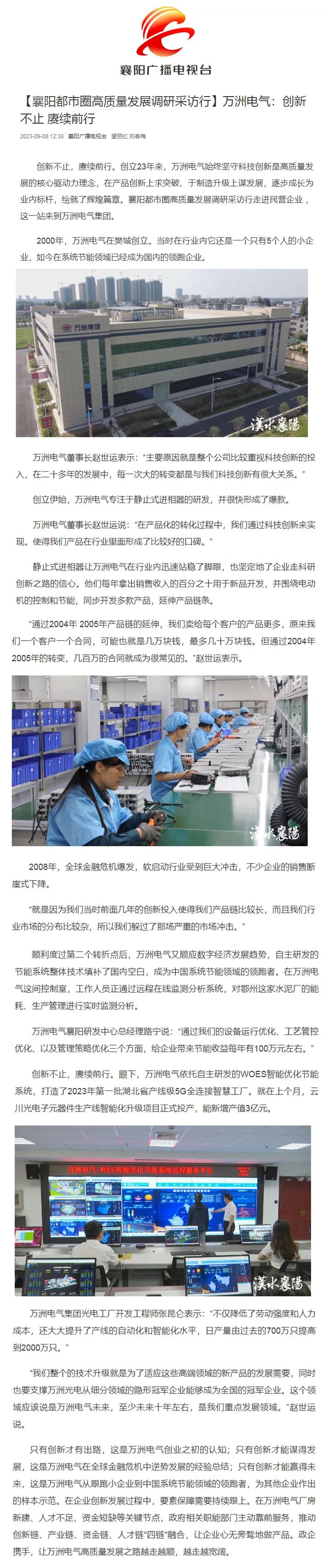创新不止,赓续前行。创立23年来,万洲电气始终坚守科技创新是高质量发展的核心驱动力理念,在产品创新上求突破、于制造升级上谋发展,逐步成长为业内标杆,绘就了辉煌篇章。襄阳都市圈高质量发展调研采访行走进民营企业 ,这一站来到万洲电气集团。