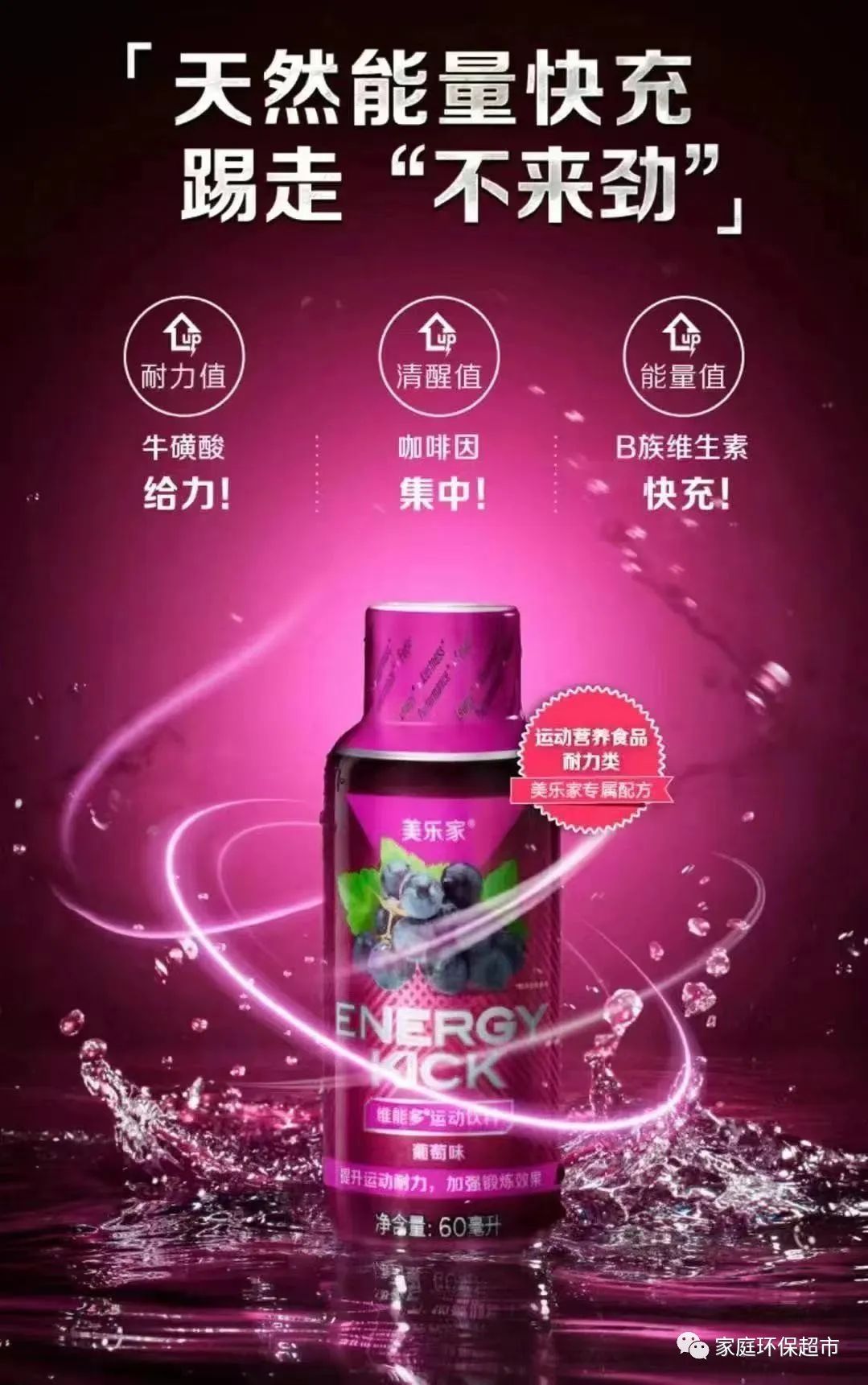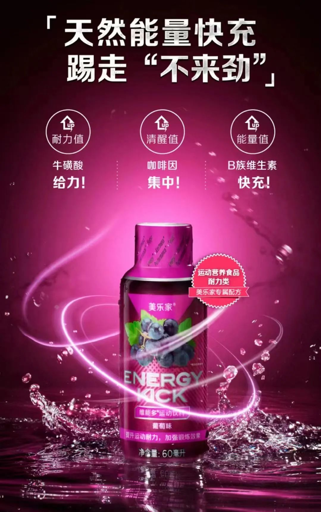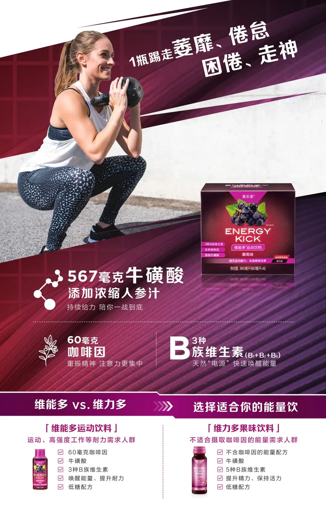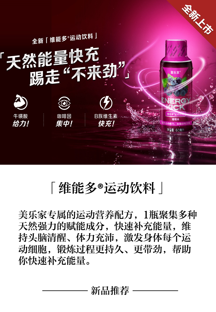 运动中乏力?竞技赛疲惫?加夜班困惑?开长途走神?你需要呼叫“能量踢”,维能多运动饮料,天然能量快充,踢走“不来劲”!