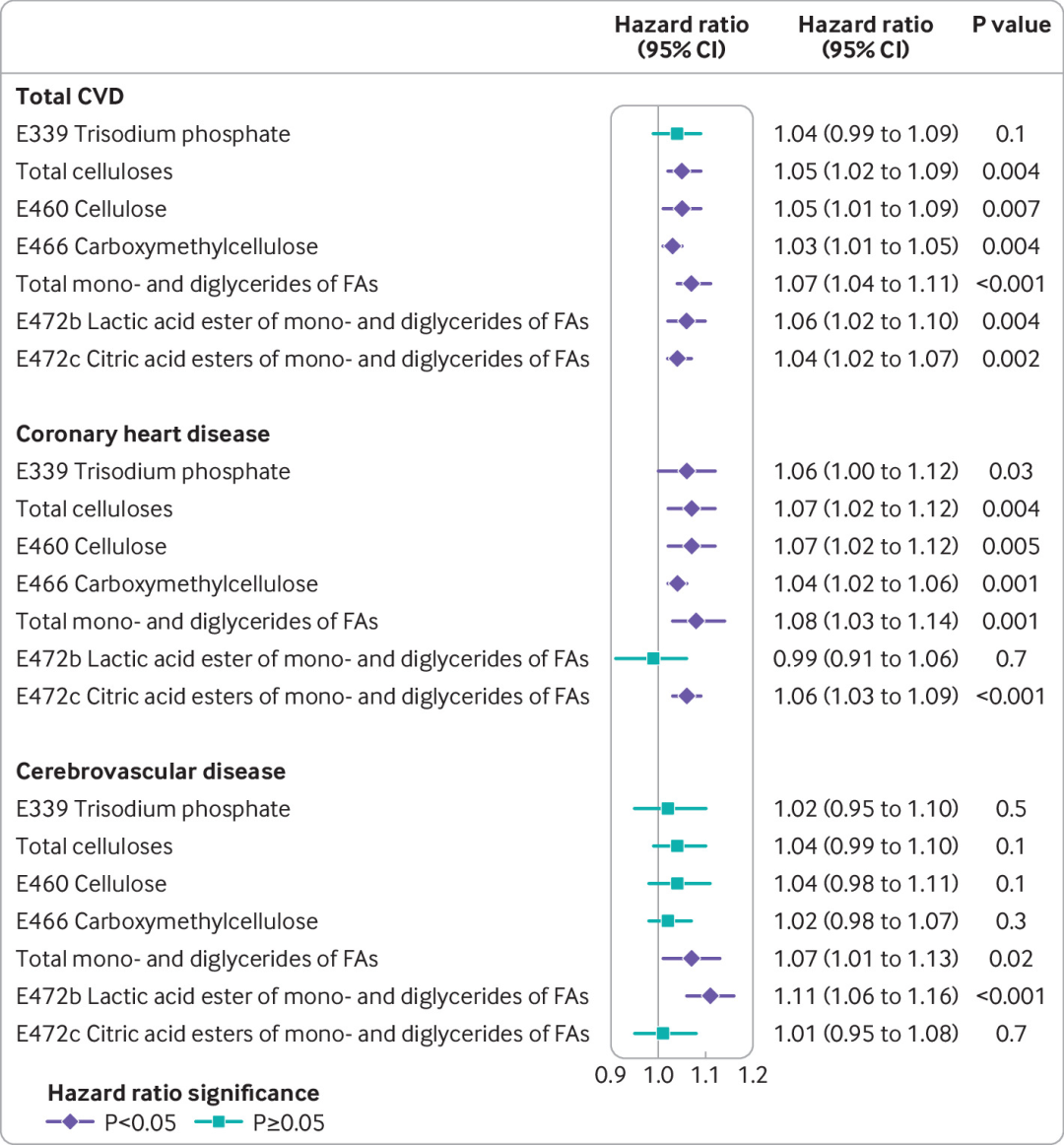 研究结果发现:参与者的平均年龄为43.1岁(14.5),79.0%(n=75,390)是女性。在随访期间(中位数为7.4年),诊断出1995例心血管疾病(CVD),1044例冠心病和974例脑血管疾病。纤维素摄入量较高与CVD风险升高(HR per 1SD=1.05, 95% CI: 1.02-1.09,P=0.003)和冠心病风险增高(HR=1.07, 1.02-1.12,P=0.004)显著相关。具体而言,较高的纤维素摄入量与CVD(HR=1.05, 1.01-1.09,P=0.007)和冠心病(HR=1.07, 1.02-1.12,P=0.005)的风险升高有关,而较高的羧甲基纤维素摄入量与CVD(HR=1.03, 1.01-1.05,P=0.004)和冠心病(HR=1.04, 1.02-1.06,P=0.001)的风险较高有关。此外,较高的脂肪酸甘油单酯或二酯的摄入量与所有结局终点的风险较高有关。在这些乳化剂中,脂肪酸甘油单酯或二酯中的乳酸酯与CVD(HR=1.06, 1.02-1.10,P=0.002)和脑血管疾病(HR=1.11, 1.06-1.16,P<0.001)的风险较高有关,而脂肪酸甘油单酯或二酯中的柠檬酸酯与CVD(HR=1.04, 1.02-1.07, P=0.004)和冠心病(HR=1.06, 1.03-1.09,P<0.001)的风险增高有关。大量摄入磷酸三钠与冠心病风险增加有关(HR=1.06, 1.00-1.12,P=0.03)。敏感性分析显示了一致的关联。