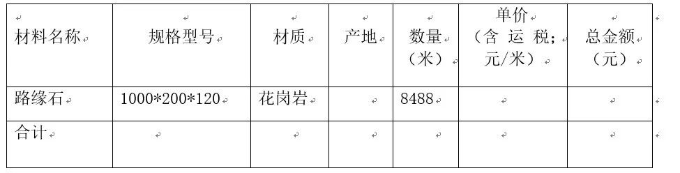 2、投标文件:投标文件需提交企业资质信息及报价单。报价单详细说明如下:路缘石材料为花岗岩,长度约为8488米(结算时按实际到货数量结算),尺寸为1000*200*120,2公分倒角;货物交付地为项目地址;各投标单位需按下列表格提交报价单。