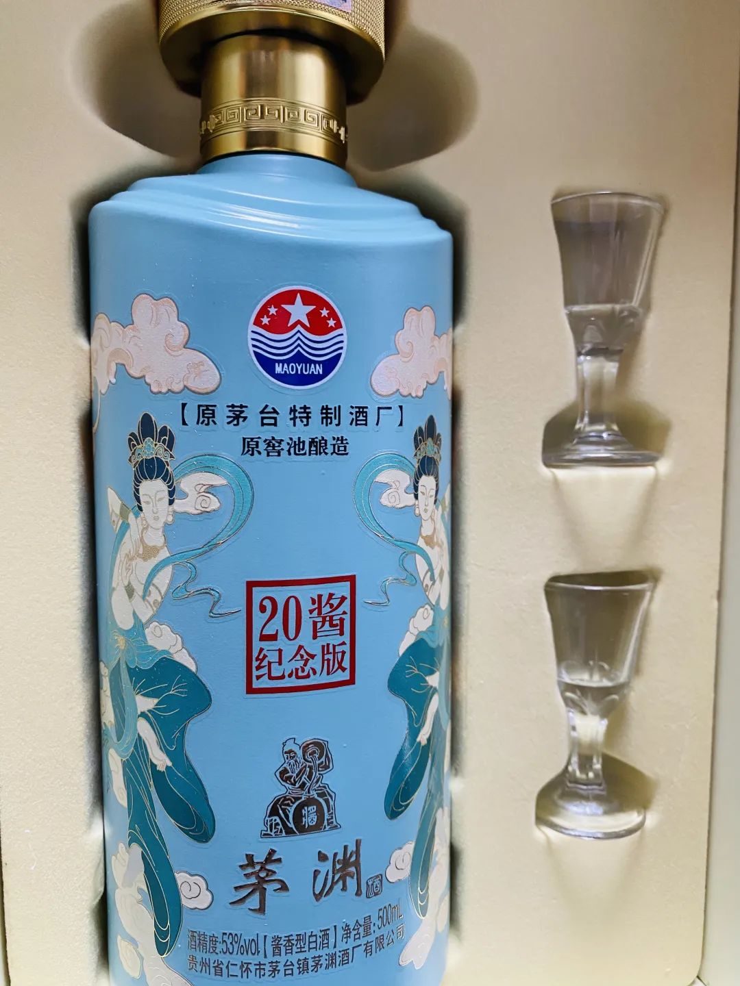 2、“12987”传统酿造工艺,古法工艺酿造,品酒大师冯小宁特别限量酿制;3、53度黄金赏味刻度,精致礼盒包装,还赠2个品鉴小酒杯,送人、自饮有档次;好山好水出好酒,茅台镇地处东经106°22′,北纬27°51′,这里气候湿热、潮闷,年平均温度16.7℃。镇内赤水河,集灵泉于一身,汇秀水而东下,被誉为“美酒河”。这里的水质、土壤、气候对于酒料的发酵、熟化非常有利,同时具有不可复制的微生物环境。茅渊酒厂位于茅台镇核心产区,这里海拔约400米,地形呈凹字形,聚热不散热,平均温度比周边地区都高,利于微生物菌群的生长。正是因为这得天独厚的酿造环境,20酱奇香独秀,风格典雅,为酒之精品。20酱原料采用茅台镇特有的红缨子糯高粱、优质小麦,以及富含矿物质成分的赤水河水。大家可以看到,配料表上清清楚楚的写着高粱、小麦、水,除此之外没有其他任何添加!执行标准:GB/T26760-2011,质量等级:优级。是国家规定的酱香型白酒执行标准,在品质上,优级>一级>二级。一闻就知道是好酒,酱香味突出,仅一小杯即香溢满室。一股幽雅的芳香扑鼻而来,饮酒入喉,香味中夹杂着醇甜浓郁的酱香风味缓缓往下流。茅渊酒厂有一组特殊的工艺密码“12987”,代表:一年的生产周期、二次投料、九次蒸煮、八次加曲、七次取酒。第一步制曲:端午开始投放小麦生产酒曲,称之为端午制曲。小麦粉碎发酵四十天,到成品酒曲,全程大约三个月到半年。第二步制酒:重阳下沙(二次投料)加入酒曲,搅拌均匀,进行高温堆积,老窖池发酵。9次蒸煮(馏),8次摊晾、加曲、堆积、入窖,7次取酒。从投料到产品出厂,要经过30道工序,165个工艺环节的锤炼。第三步贮存与勾调:基酒(轮次酒)分酱香、醇甜香、窖底香3种典型体贮存于陶坛中。由品酒大师冯小宁以不同年龄的酱酒相互“以酒勾酒”,才能达到绝佳的口感!但是这里的勾调,不是小白眼中的劣质酒精勾兑,它完全是两个事情!那种真年份真酱香,不是一般酱香酒可以比拟的,那种口感无与伦比!老司机一品就能品出,陈年酱香白酒的口感!老工艺,真年份,好酒!!!此时酒精分子和水分子容易结合,再加上长期储存,使得游离分子越来越少,对身体的刺激也随之变小。我们还去品牌去标签,让专业的行家进行了品鉴,20酱在专业盲评阶段获得了一致好评。酒液透明晶亮,无悬浮无沉淀,轻轻摇动酒体,挂杯明显。闻起来是醇厚的老酒香,不像新酒那样冲鼻,酱香突出,空杯留香经久不散。口感醇厚,层次感丰富,喝后不口干,不头痛,有一种意犹未尽的感觉。诱人的风味,喝过一次就很难忘记。小杯喝,更讲究。喝上一口,浓郁幽雅的酱香在舌尖爆开,绵柔顺滑,让人忍不住沉醉。细细品味,醉心不上头,从舌尖到心尖,满满的都是酒的格调、魅力和与生俱来的优雅~自己喝口感醇厚、满口粮香,心情才会舒畅;招待客人不辣喉、不上头,推杯换盏才有面子,谈生意事半功倍!高雅礼盒包装,大气尊贵,一瓶500ml,拿在手里沉甸甸的很有分量。还附赠2个品鉴小酒杯和精美礼品袋,无论是送礼,或是拿出来与亲朋好友共饮,都非常有面子。