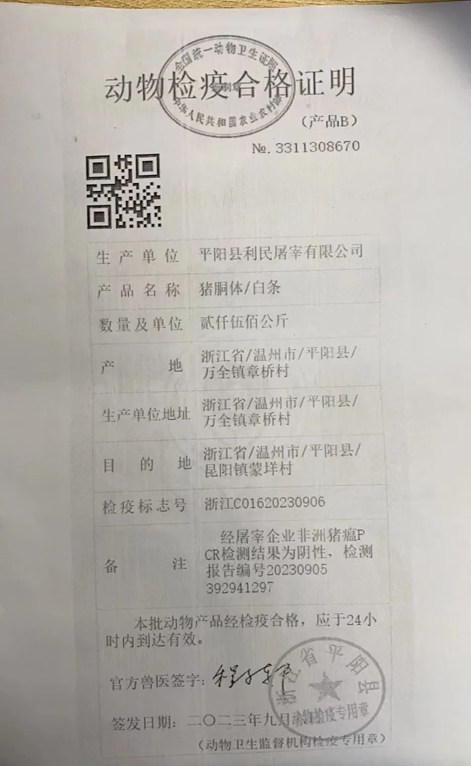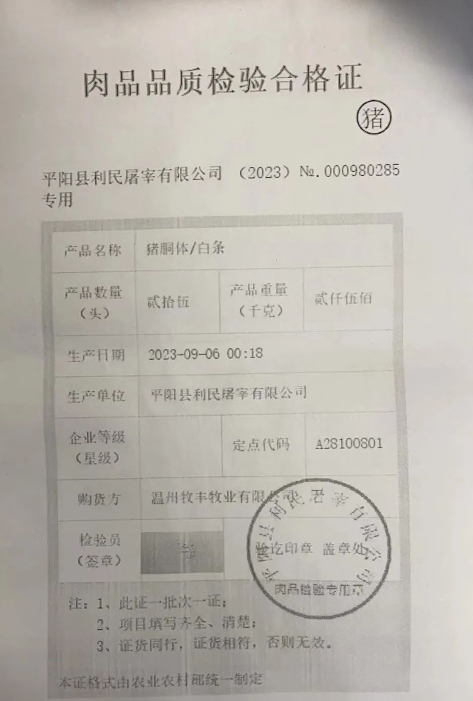 肉质品质检验合格证