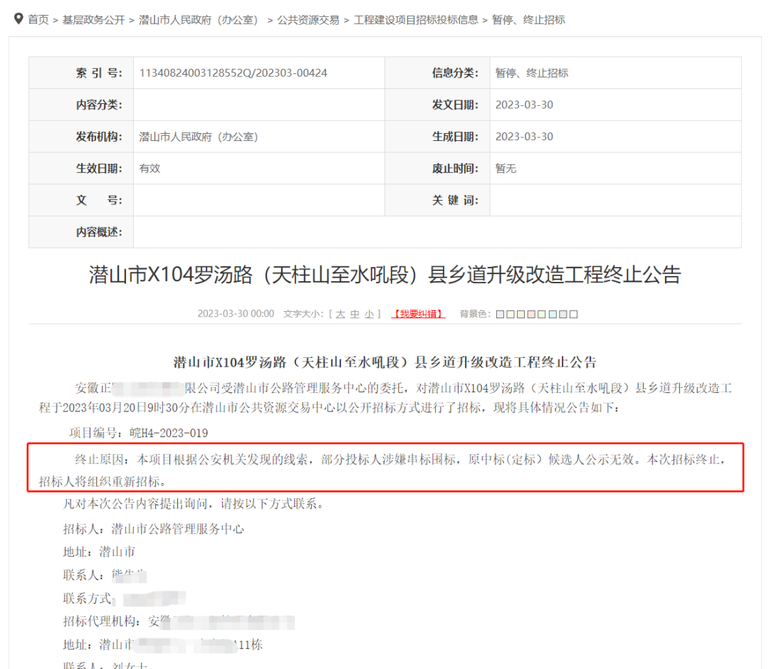 3月30日,官方发布该公路工程终止公告,原因是:发现部分投标人涉嫌串标围标。
