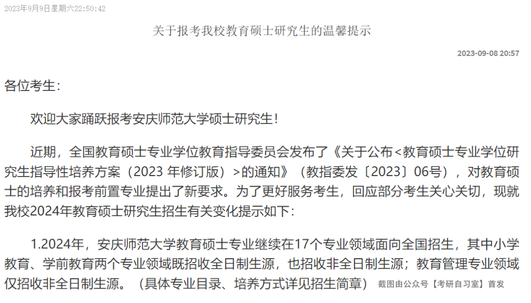 1、安庆师范大学研究生院:关于报考我校教育硕士研究生的温馨提示