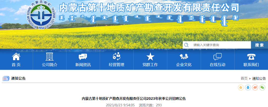 内蒙古第十地质矿产勘查开发有限责任公司2023年秋季公开招聘公告