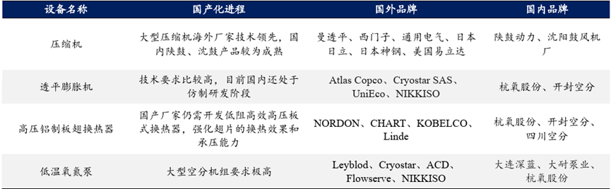 成套设备国产化率高,核心部件国产替代进行时。2016年来,我国6 万方及以下等级的成套空分设备的国产化率从50%-70%提高到 80%以上,6万以上等级成套空分设备的国产化率从35%提高到 60%以上。而一套空分装置由 70 多个单元设备组成,空分设备国产化不仅要实现成套技术国产化,还要实现压缩机、膨胀机、板翅式换热器、低温液体泵等关键设备的国产化。