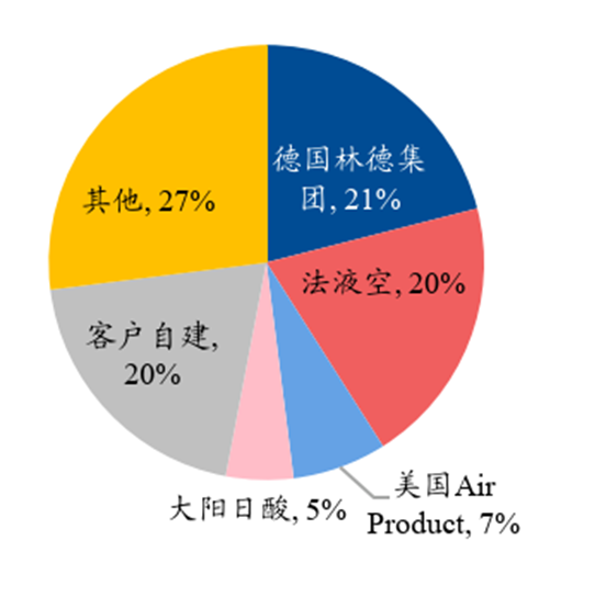 国际工业气体市场份额主要由林德、法液空两大巨头占据。全球工业气体市占率方面,据华经产业研究院,德国林德、法国液化空气两家工业气体集团齐头并进,2021年全球市占率分别为21%、20%,第二梯队的美国空气产品、日本大阳日酸工业气体公司2021年市占率则分别为7%、5%。