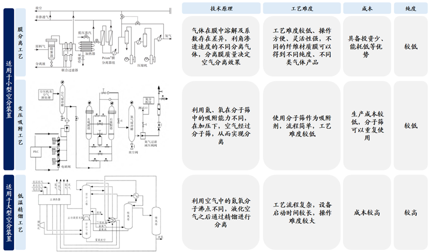 空分气体的制备方式中,低温精馏工艺是大型空分设备通常采用的制气工艺。目前行业中共有低温精馏、膜分离、变压吸附三种主流空气分离工艺流程,其中低温精馏工艺具有高质量、高产出的特性,运行稳定、产品纯度高、适合大规模生产。小型空分装置则更多使用膜分离工艺和变压吸附工艺,因为其启动所需时间不长并且负荷调整范围宽,有成本较低、操作简单、制取灵活的优势。