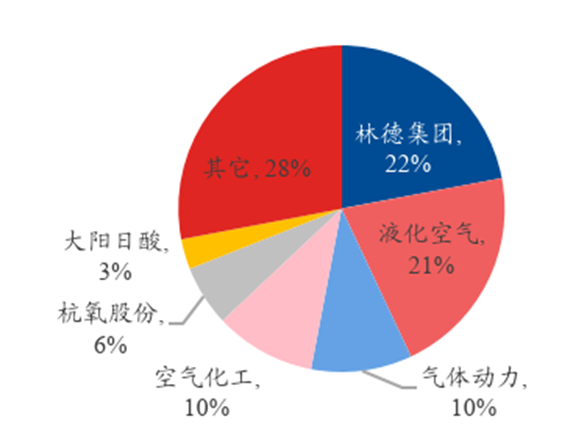 ✓中国工业气体市场呈现寡头竞争格局,2021年林德集团、液化空气、空气化工、大阳日酸四大国际巨头占据国内55.7%的市场份额,头部国产企业气体动力和杭氧股份市占率分别为10.1%和6.3%