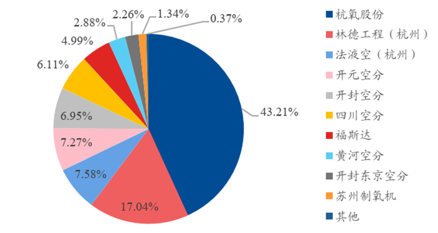 国内空分设备行业CR5 达82.05%。国内主要空分设备商包括国内企业杭氧股份、开元空分、开封空分、四川空分和福斯达等,也有外资供应商如林德、法液空等。据杭氧股份可转债募集说明书中援引《气体分离设备行业统计年鉴》数据,按照制氧总容量口径计算,2020年国内空分设备市场中,杭氧股份市占率达43.21%,高居第一,其后是外资林德和法液空,市占率分别为17.04%和7.58%。国内空分设备市场集中度较高,CR5达82.05%,CR10 达 99.63%。