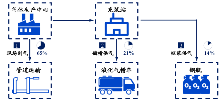 外包工业气体厂商的常见供应模式可分为零售供气和大宗供气两种。大宗供气为现场制气,指供气公司在用户现场投资空分设备直接供气,或通过管道为一定区域内多个用户供气。零售供气分为瓶装供气和储槽供气,瓶装气体主要满足现货市场需求,适合小批量气体用户。液体槽车适用于中等批量需求客户或用气需求波动较大,对多种气体有零碎需求的客户。据前瞻产业研究院数据,2019年我国工业气体供应模式结构中,管道气占比约65%,液态气占比约21%,瓶装气占比约 14%。