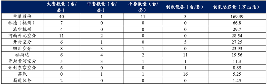 国内企业杭氧占据空分设备行业领先地位。从制氧容量来看,国内空分设备龙头杭氧股份2020 年销售空分设备对应总制氧容量为169.39 万m3/h,市占率达43.21%,遥遥领先于林德、法液空两家外资龙头。另外,杭氧股份在技术含量更高的大型空分设备领域实现了特大型成套空分设备的生产以及关键部机技术的开发,占据了我国大型空分设备市场的头把交椅。2020年杭氧股份销售的大型空分设备数量达到40 台,领先于林德的7 台、液化空气的 4 台,占 2020 年大型空分设备市场总销量95 台的42.11%。