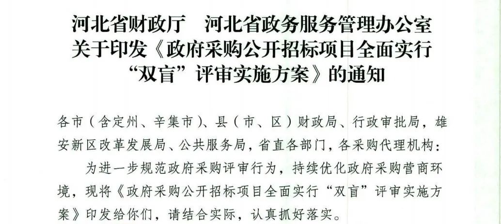 近日,河北省财政厅、河北省政务服务管理办公室发布关于印发《政府采购公开招标项目全面实行“双盲”评审实施方案》的通知,明确: