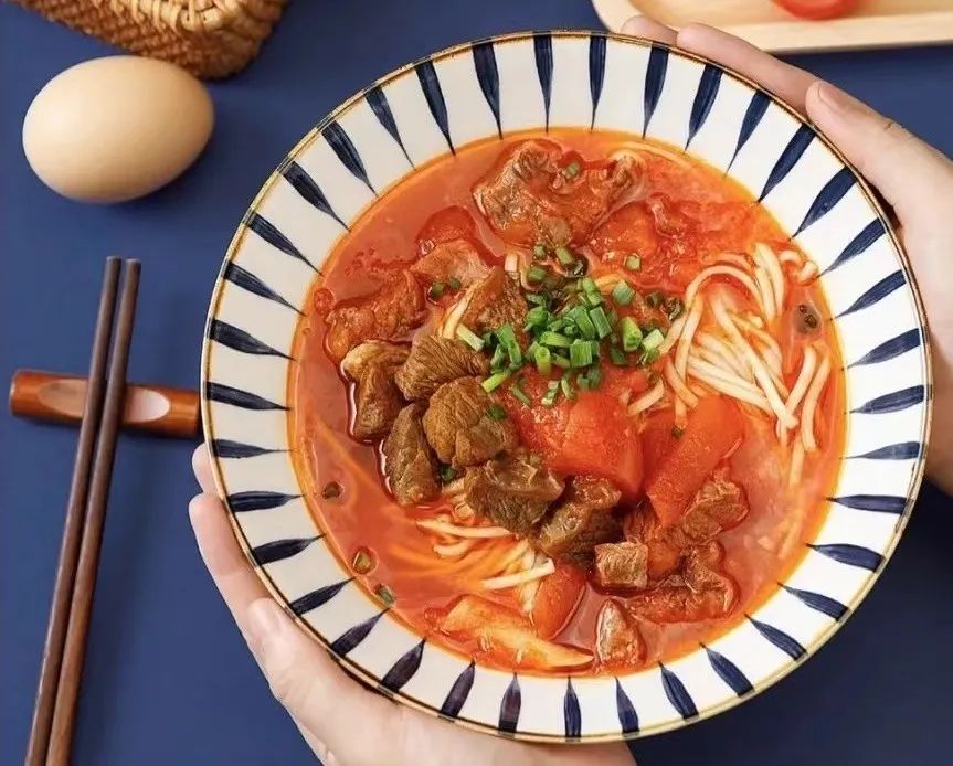 西红柿牛腩面、水煮蛋
