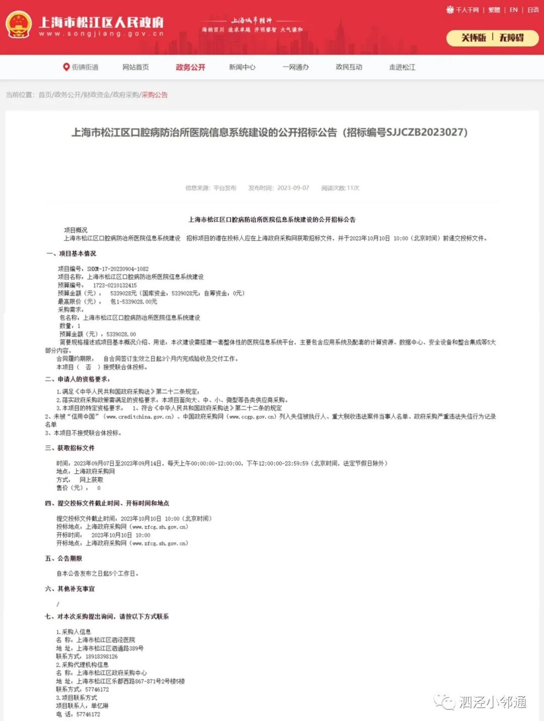 上海市松江区口腔病防治所医院信息系统建设的公开招标公告(招标编号SJJCZB2023027)