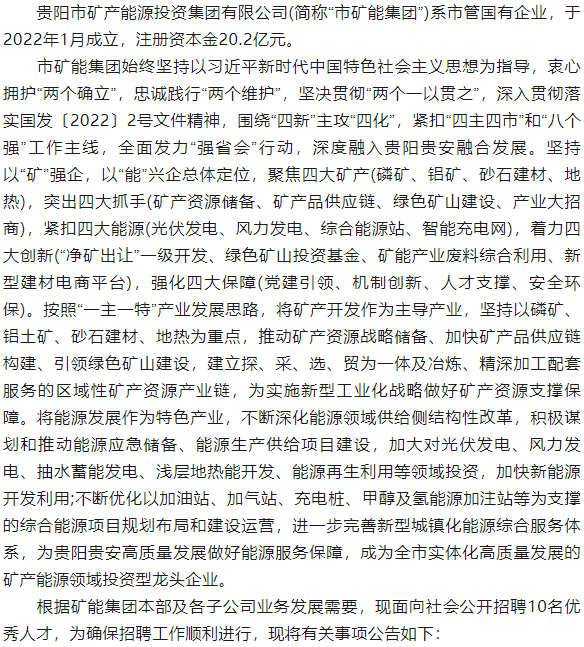 贵阳 | 市矿产能源投资集团有限公司2023年第四批招聘10名工作人员(报名时间:9月14日起)