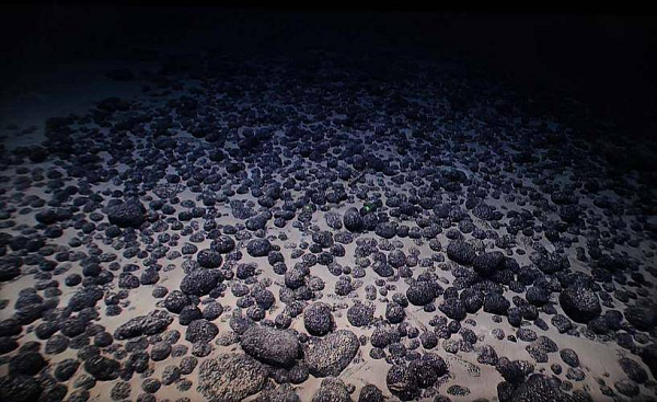多金属结核又称锰结核,因其富含锰、铜、钴、镍等30多种金属元素而得名,是一种围绕核心生长的铁、锰氢氧化物壳层组成的黑色和褐黑色核形石。它们主要分布在水深2000—5000米的平坦海底,大小不一,有的犹如小土豆般大小,有的直径可达几十厘米。如果把它剖开,可以看到非常完美的圈层结构——多金属结核通常分为内核和外层两部分,内核可以是岩石、固结的沉积物、海洋生物的骨骼或牙齿,甚至是年龄较老的结核;而外层则主要由铁、锰氢氧化物,以及少量的石英和长石等碎屑状物质组成。多金属结核含有锰、铁、镍、钴、铜等几十种元素。世界海洋3500—6000米深的洋底储藏的多金属结核约有3万亿吨。其中锰的产量可供世界用18000年,镍可用25000年。