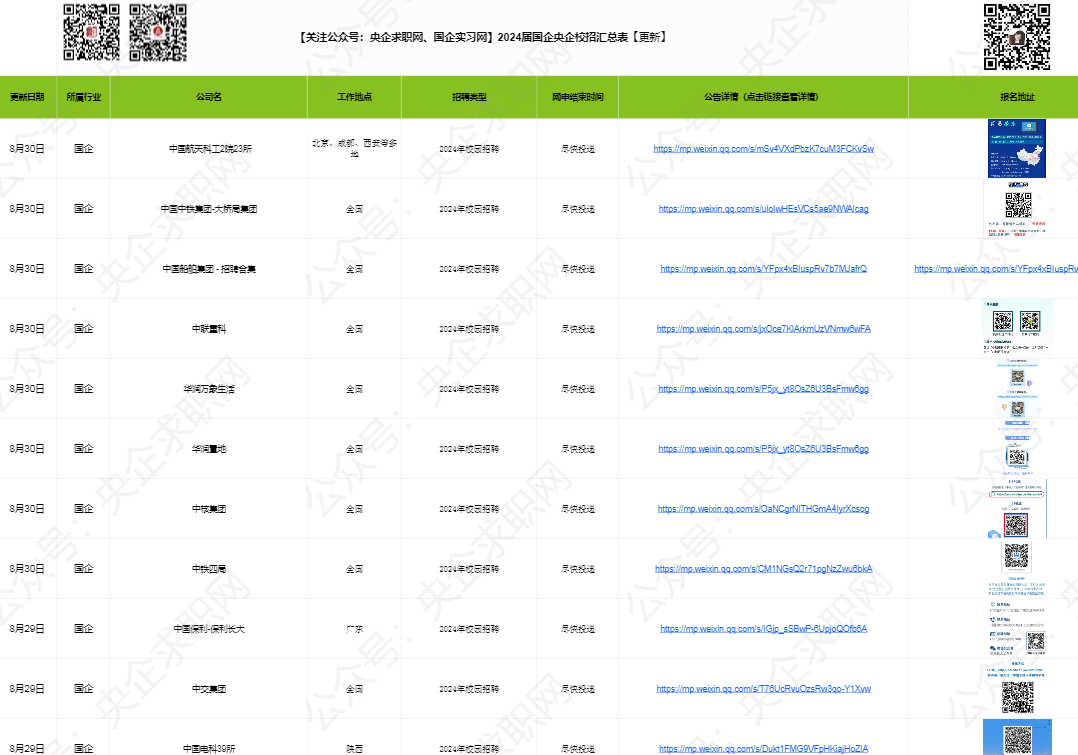 ☛ 国企2024校招/实习汇总表(每日更新10+)