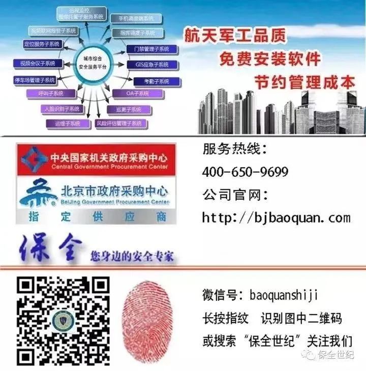 通过“可视化管理”“指挥调度中心”“人脸识别监控”为保安队伍配备上“大脑和眼睛”;通过“多媒体即时通讯”“巡查巡检信息上报”升级保安队伍的通讯手段;通过“建立重点人员黑名单信息库”“大数据库智能分析”为保安队伍升级监测手段;通过“外来访客管理”“门禁管理制度”“车位智能引导”为保安队伍减少人力成本;通过“线上职业技能培训”“心理评测”“考勤打卡制度”为保安队伍明确纪律,这一系列的技术手段辅助保安队伍,让保安队伍从一盘散沙的“雇佣兵”变为组织严密的“正规军”。