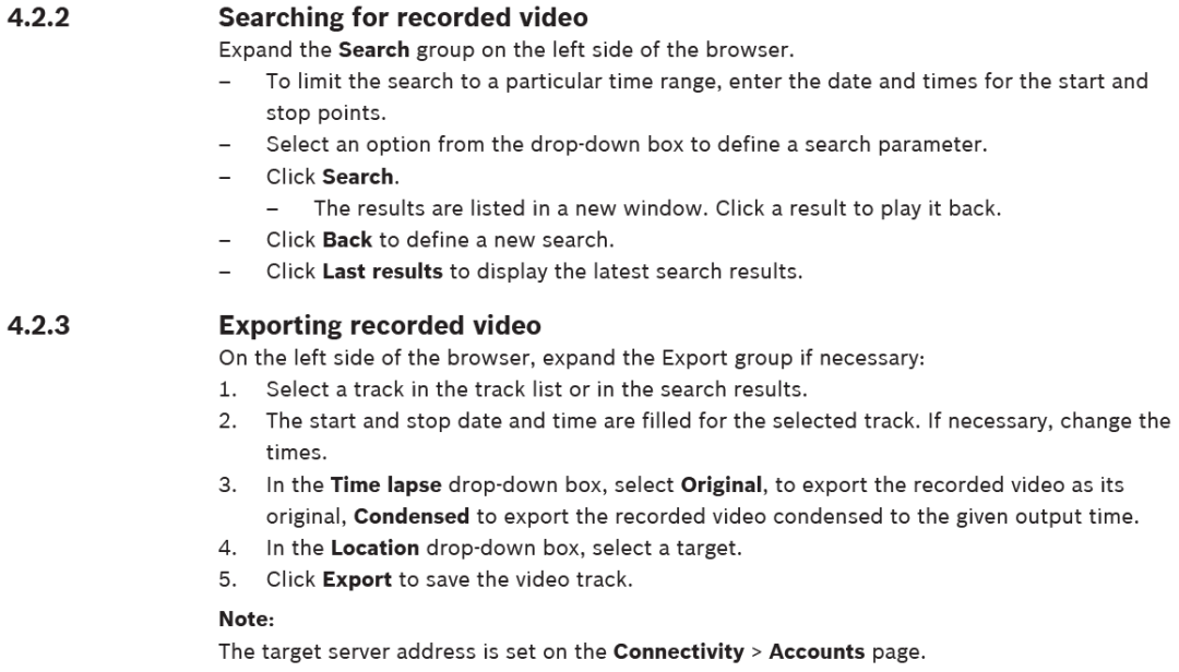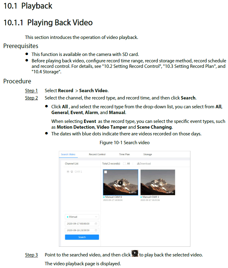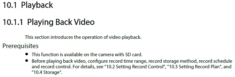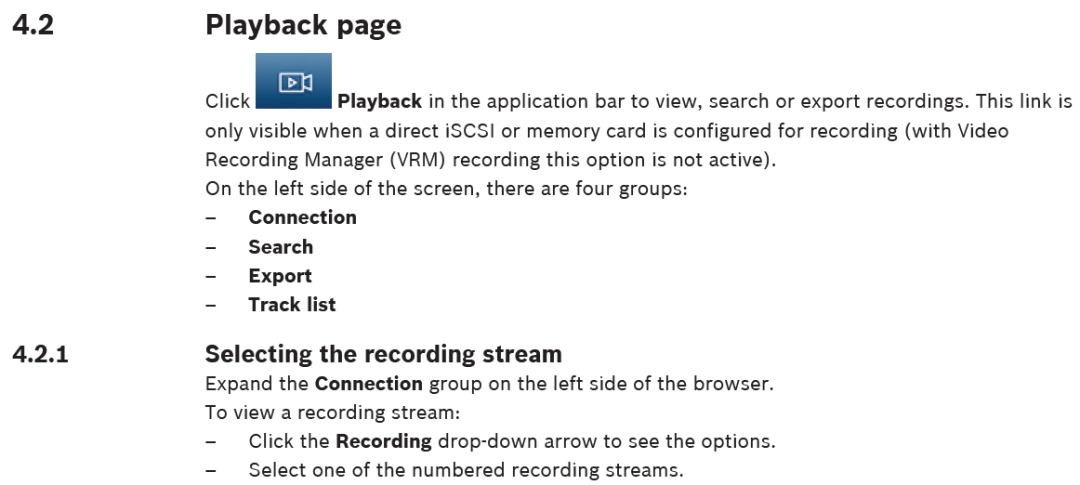 大华的手册中有些标题没有引言,比如下图 10.1 Playback 标题下如果能讲一下“回放”的基本功能,对用户理解功能会非常有帮助。再看博世手册,在标题 4.2 Playback page 下对“回放”首先做了介绍,帮助用户了解功能。