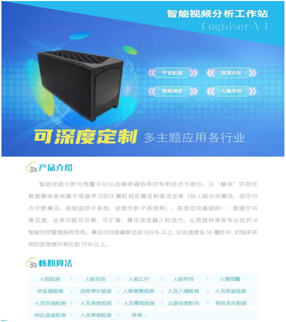 专业打造的智能分析工作站,以”模块”的形式智能集成基于深度学习的计算机视觉算法和各项业务。经过算法的深度学习,平台可以适应各种场景之下的人脸对象捕获识别、动作行为目标分析、衣着服饰捕获检测、人车物行为跟踪等,实现应用基础统一、数据可共享互通、业务功能可分离、可拓展,算法灵活植入和迭代,从而提供各类专业性的协同管理服务体系。