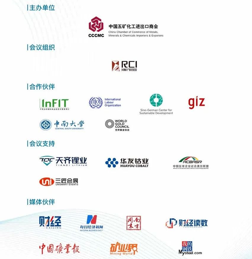 本届论坛得到了中英合作国际林业投资与贸易项目(InFIT)、中德可持续发展中心(CSD)、德国国际合作机构(GIZ)、国际劳工组织(ILO)、世界黄金协会(WGC)和中南大学等合作伙伴以及天齐锂业股份有限公司、浙江华友钴业股份有限公司的大力支持。
