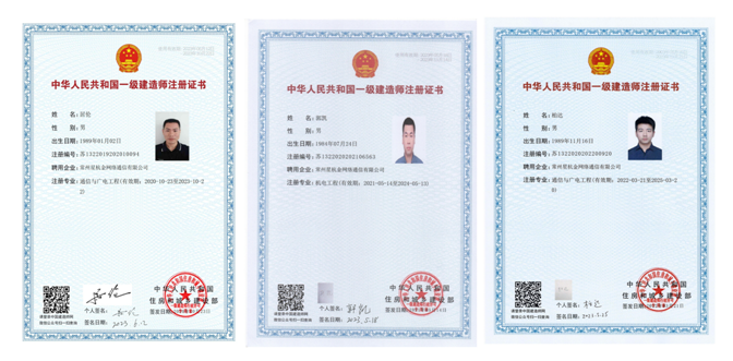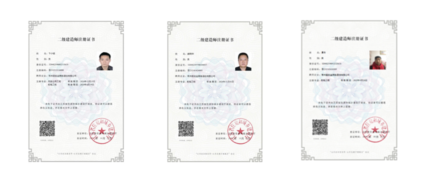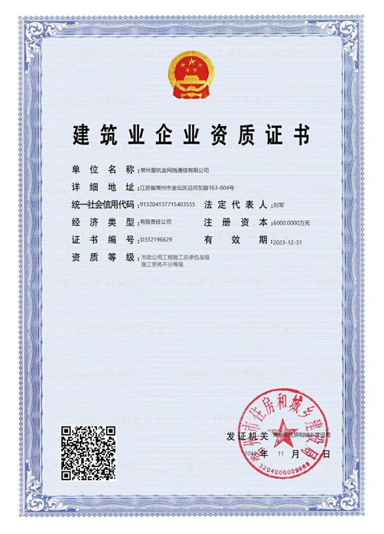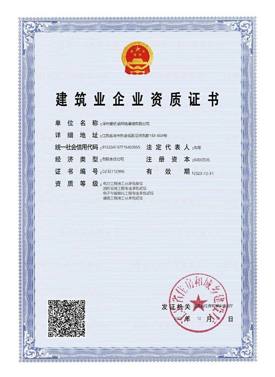 公司现有资质证书:通信工程施工总承包贰级、电力工程施工总承包叁级、电子与智能化工程专业承包贰级、消防设施工程专业承包贰级、市政公用工程总承包叁级、施工劳务不分等级、承装修试电力设施许可证-五级、质量、环境、职业健康管理体系认证证书。