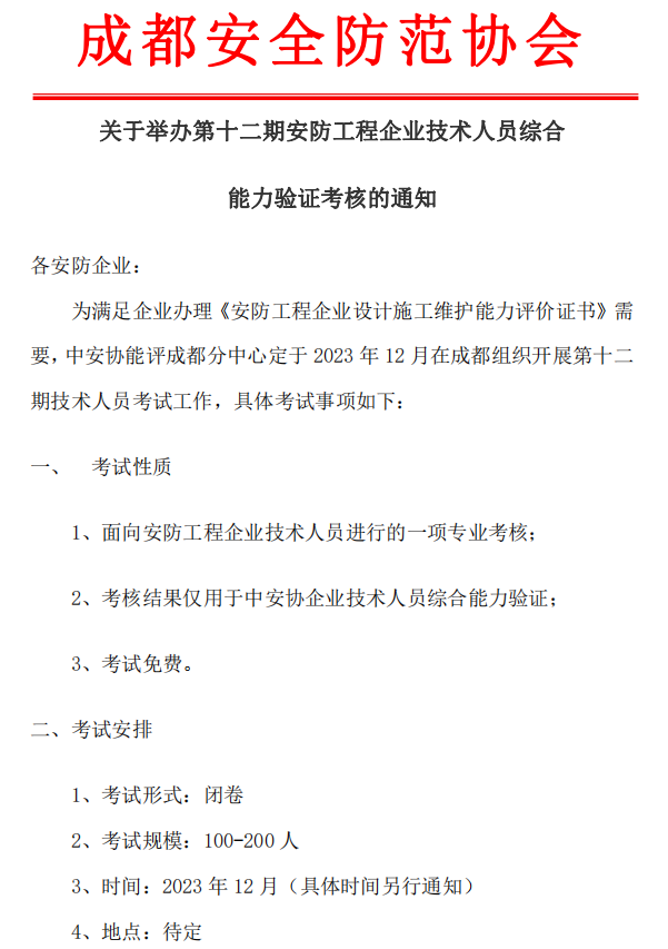 关于举办第十二期安防工程企业技术人员综合能力验证考核的通知