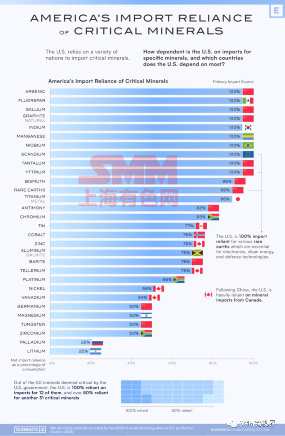 上述矿产都在美国政府的关键矿产清单上。美国100%依赖进口的矿产包括砷、萤石、镓、铟、锰、铌和钽等,这些矿物用于各种应用,如合金和半导体的生产,以及LCD屏幕和电容器等电子元件的制造。中国是13个最大依存地中7个的主要供应国。美国对另外31种关键矿产的进口依赖度超过50%,显示美国对每种矿物的需求有多大比例是通过进口满足的。