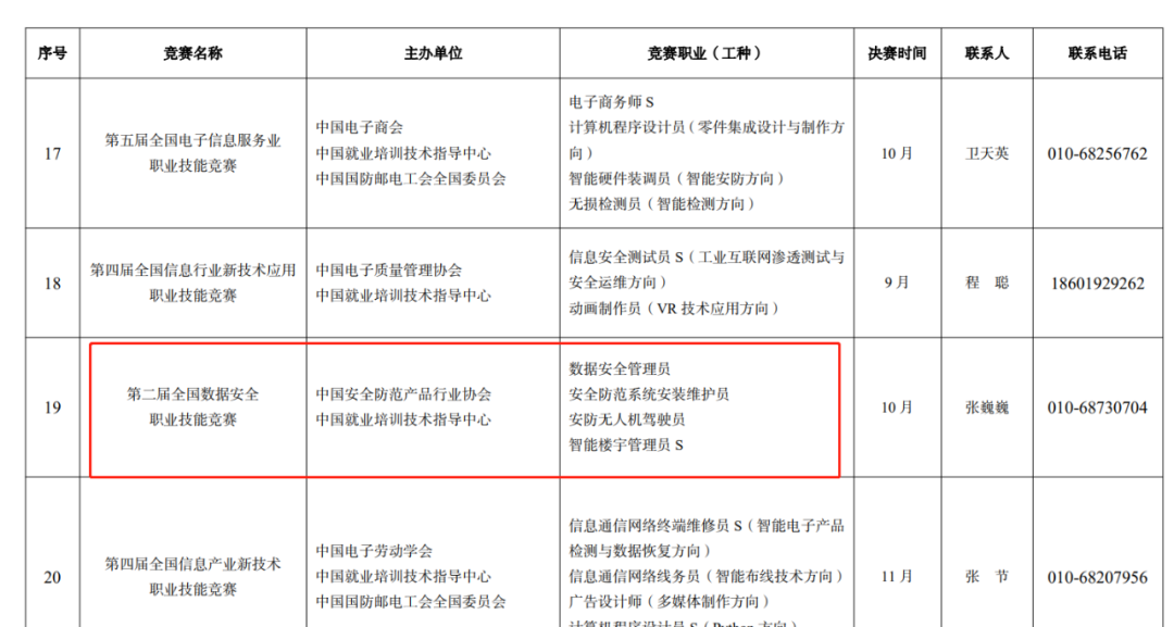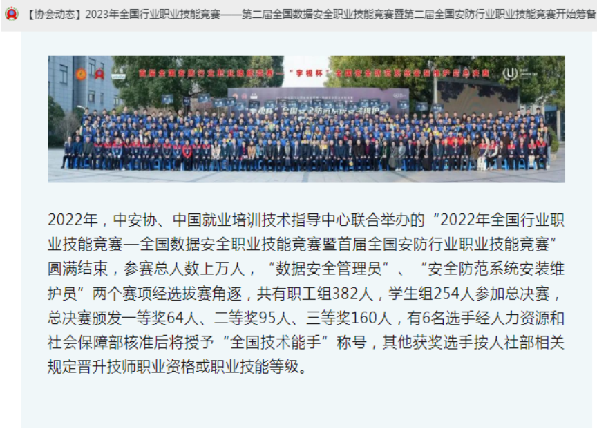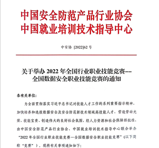 为全面贯彻落实习近平总书记对技能人才工作的系列重要指示精神,加快培养和选拔数据安全及安全防范新技术领域高技能人才,经人力资源和社会保障部批准,由中国安全防范产品行业协会、中国就业培训技术指导中心于2022年联合举办全国行业职业技能竞赛--全国数据安全职业技能竞赛;2023年7月24日,人力资源社会保障部(以下简称“人社部”)发布《关于组织开展2023年全国行业职业技能竞赛的通知》(人社部函〔2023〕80号),中国安全防范产品行业协会(以下简称“中安协”)、中国就业培训技术指导中心联合举办2023年全国行业职业技能竞赛——第二届全国数据安全职业技能竞赛暨第二届全国安防行业职业技能竞赛(以下简称“竞赛”)。本次竞赛以“技能成才 技能报国”为主题,下设四个职业(工种)分别是“数据安全管理员”、“安全防范系统安装维护员”、“安防无人机驾驶员”、“智能楼宇管理员S”。目的是着力提高职业技能竞赛科学化、规范化、专业化水平,创新组织形式,提高竞赛质量,推广竞赛成果,实现以赛促学、以赛促训、以赛促评、以赛促建。积极营造劳动光荣、技能宝贵,为全面提高安防技能人才素质、推动行业数字化转型、高质量发展,建设现代化安防产业体系提供有力人才保障。现第二届竞赛预报名工作已经开始,深圳市智慧安防行业协会作为本次竞赛组织单位,欢迎各有关单位及相关人员积极参与。报名直接与招赛组委会工作人员联系。报名咨询:黄浩鑫 13798362912 824899262@qq.com