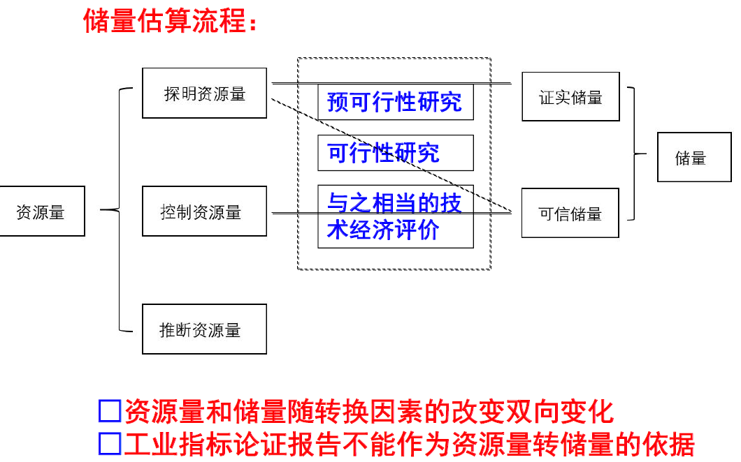 当前,依据预可行性研究报告、可行性研究报告或矿山初步设计等,以设计利用的探明资源量和(或)控制资源量为基础,结合推荐的或实际的采矿方案、采矿工艺流程,扣除各类设计损失、采矿损失后得到的可经济采出的部分。对于矿产资源储量规模为小型的矿山,估算储量确有困难的,可以采用实际回采率指标,经分析论述后估算储量。×以生产矿山保有探明+控制资源量(甚至有的带上推断资源量)乘以经验系数——采区回采率估算储量。√首先应识别区分资源量和尚难利用矿产资源,再区分哪些资源量可以转储量,哪些资源量不能转。能转储量的,根据有关矿山设计,先扣除设计损失等非开采损失,再乘以经验系数——采区回 采率估算储量。2.储量是否包括贫化物质(混入的废石和低品位矿)?