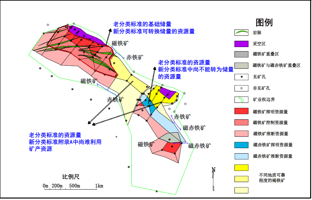 同时提交资源量和储量时,以资源量包含储量的关系进行表达,即转换为储量的那部分资源量应包含在资源量中,且应说明转换为储量的那部分资源量的数量、质量和分布范围。例:金矿资源储量核实报告资源储量估算结果如下叙述 探明资源量矿石量XX万吨,Au金属量XX吨(kg),Au品位 XX g/ t, 其中证实储量矿石量XX万吨, Au金属量XX吨(kg),Au品位XX g/t;可信储量……。控制资源量……(九)新分类标准实施后资源储量规模如何划分?