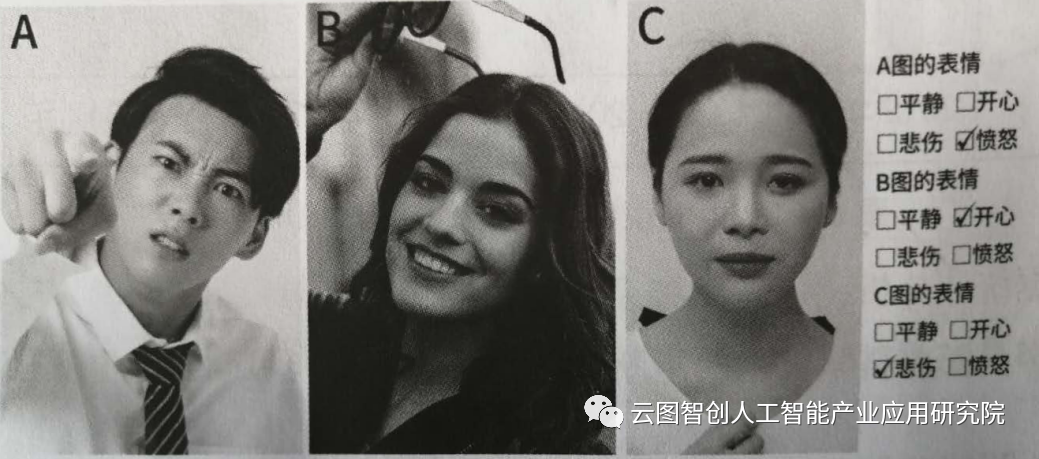 如图所示,A图中的人物表情为愤怒,B图中人物的表情为开心,C图中人物的表情是悲伤,由于表情分析在标注时会存在主观因素,所以这一类标准还没有得到广泛的应用。