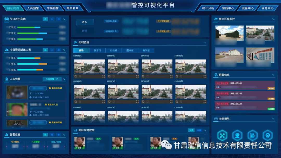 建设园区安防管控可视化平台,动态、实时、鲜活反映安保管控工作,包括告警信息、人员出入信息、视频监控、建筑分布、场馆分布座次等主题,能够综合展示园区安保整体态势与重点部位监控预警情况;能够对园区的基础数据、历史预警数据、人流量、陌生人进行统计展示;能够围绕重点区域及重点部位进行地图热点标注,实现了园区安保全要素的可视化展示,符合园区安保管控总体的设计思路。