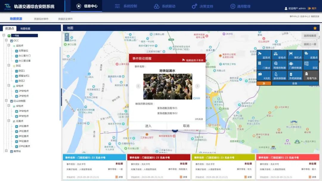 安防集成平台系统采用系统独立建设方案,设置1个线路中心级安防集成平台,22个站点级安防集成平台(含20个车站,1场1段)。系统将原分散的视频监控系统、入侵报警系统、安全检查及探测系统、出入口控制系统和电子巡查系统等安防子系统进行整合并统一管理和控制,当发生公共安全事件时,平台立即弹窗报警,联动附近资源点,报警信息、报警发生区域位置一目了然,站务人员按照系统应急预案流程及时处理,同时可将安全事件推送至分局/派出所/警务站,实现警站联动进一步提升福州地铁安全管理的信息资源共享水平,使得运营安全更有保障。
