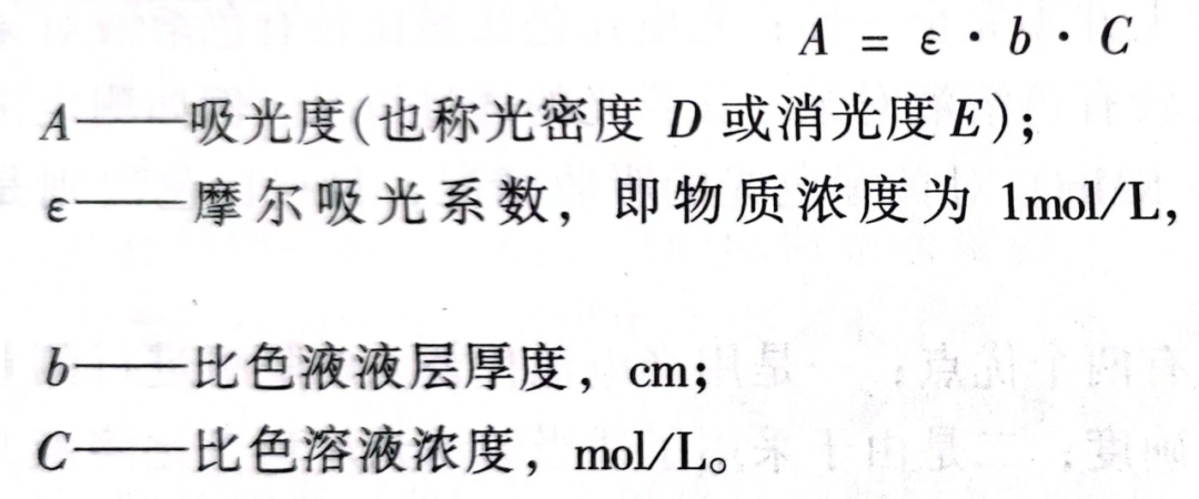 朗伯一比尔定律可表述如下:当一束单色光通过均匀溶液时,溶液的吸光度与其浓度和厚度的乘积成正比。即: