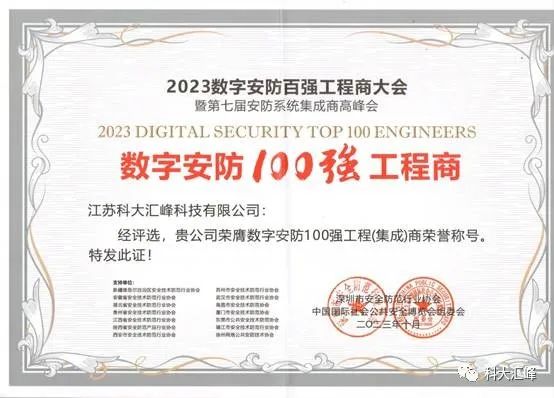 近日,我公司在2023中国数字安防百强工程商大会暨第七届安防系统集成商高峰会上荣膺“数字安防100强工程商”荣誉称号。本次大会是由第十九届CPSE安博会组委会支持,深圳市安全防范行业协会、安防系统集成商专业委员会主办,CPS中安网、CPS中安传媒承办,主题为“集合力 成未来”。在本次评选中,我公司凭借着卓越的技术实力、创新的产品和优质的服务脱颖而出,成为行业翘楚。